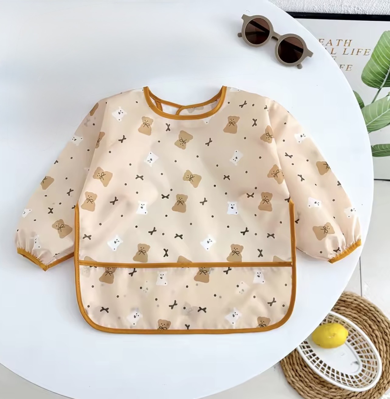 Ολόσωμη αδιάβροχη μακρυμάνικη ποδιά με σχέδιο αρκουδάκια, για γονείς που θέλουν να κρατούν τα ρούχα του παιδιού καθαρά την ώρα του φαγητού ή του παιχνιδιού.