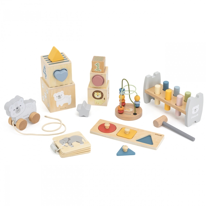 Ένα σετ σχεδιασμένο για να αναπτύσσει τη φυσική κίνηση και γνωστική ανάπτυξη των μωρών μας. Χάρη σε μια ποικιλία παιχνιδιών, τα παιδιά εξασκούνται στον συντονισμό, αναπτύσσουν την κινητικότητα των δακτύλων και των χεριών τους και μαθαίνουν να αναγνωρίζουν σχήματα και χρώματα. Πολύχρωμα στοιχεία και ξύλινα ζωάκια τραβούν την προσοχή τους και τα ενθαρρύνουν να ανακαλύπτουν και κάτι καινούργιο κάθε μέρα.