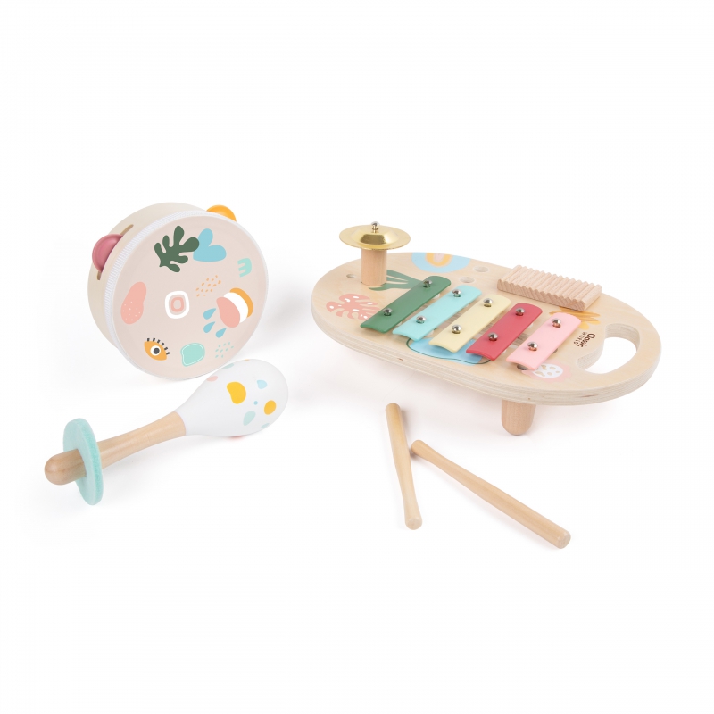 Ένα παιχνίδι για να αναπτύξει ο μικρός μας φίλος τις μουσικές δεξιότητες, τη δημιουργικότητα και τη φαντασία. Με το Iris Music Set το παιδί σας μπορεί να εξερευνήσει τον κόσμο της μουσικής και του ήχου με εύκολο και ευχάριστο τρόπο, από μικρή ηλικία καθώς τα όργανα ταιριάζουν τέλεια στα μικρά του χεράκια. Όλα τα όργανα που περιλαμβάνονται είναι κατασκευασμένα από ξύλο υψηλής ποιότητας και βαμμένα σε όμορφες πολύχρωμες αποχρώσεις με μοτίβα ζώων και φύσης με μη τοξικά χρώματα, ασφαλή για τα παιδιά και το περιβάλλον. Δεν έχουν αιχμηρές άκρες και η επιφάνειά τους είναι λεία.
