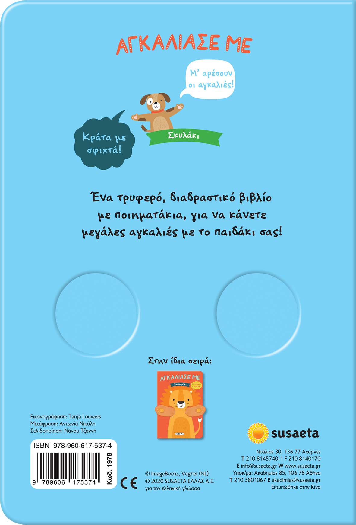 Το βιβλίο «Αγκάλιασέ με σκυλάκι» από τις εκδόσεις Susaeta, με τα μαλακά χεράκια του, είναι ιδανικό για βρέφη και μικρά παιδιά καθώς ενθαρρύνει την αλληλεπίδραση μέσα από το παιχνίδι και την αφή. Το πολύχρωμο περιεχόμενο και οι φιλικές εικόνες δημιουργούν ένα ευχάριστο και ασφαλές περιβάλλον ανάγνωσης.