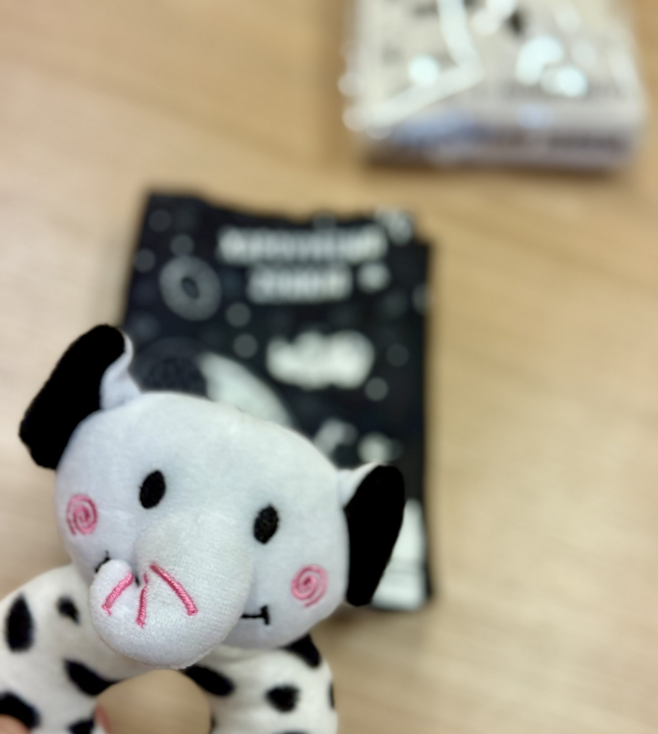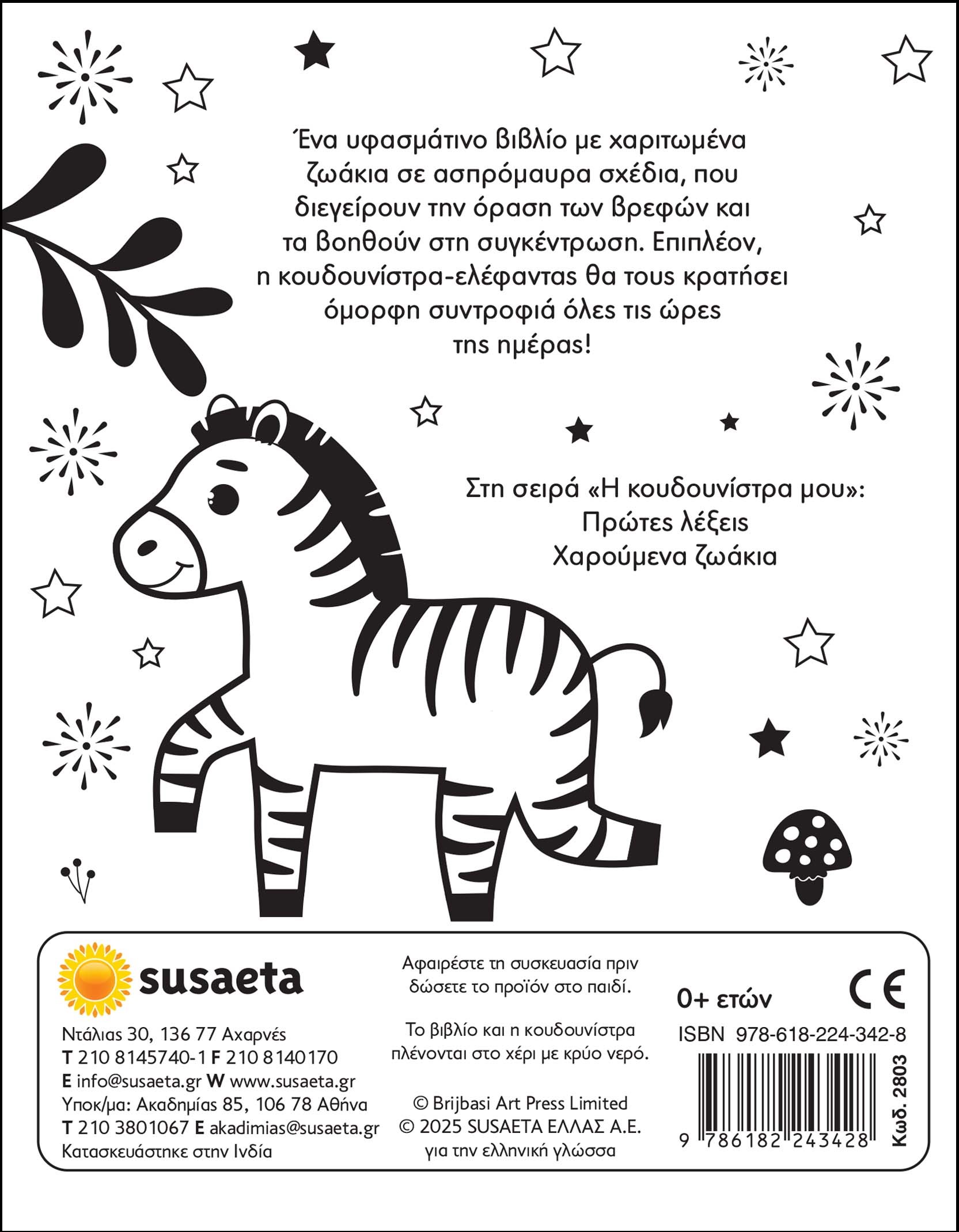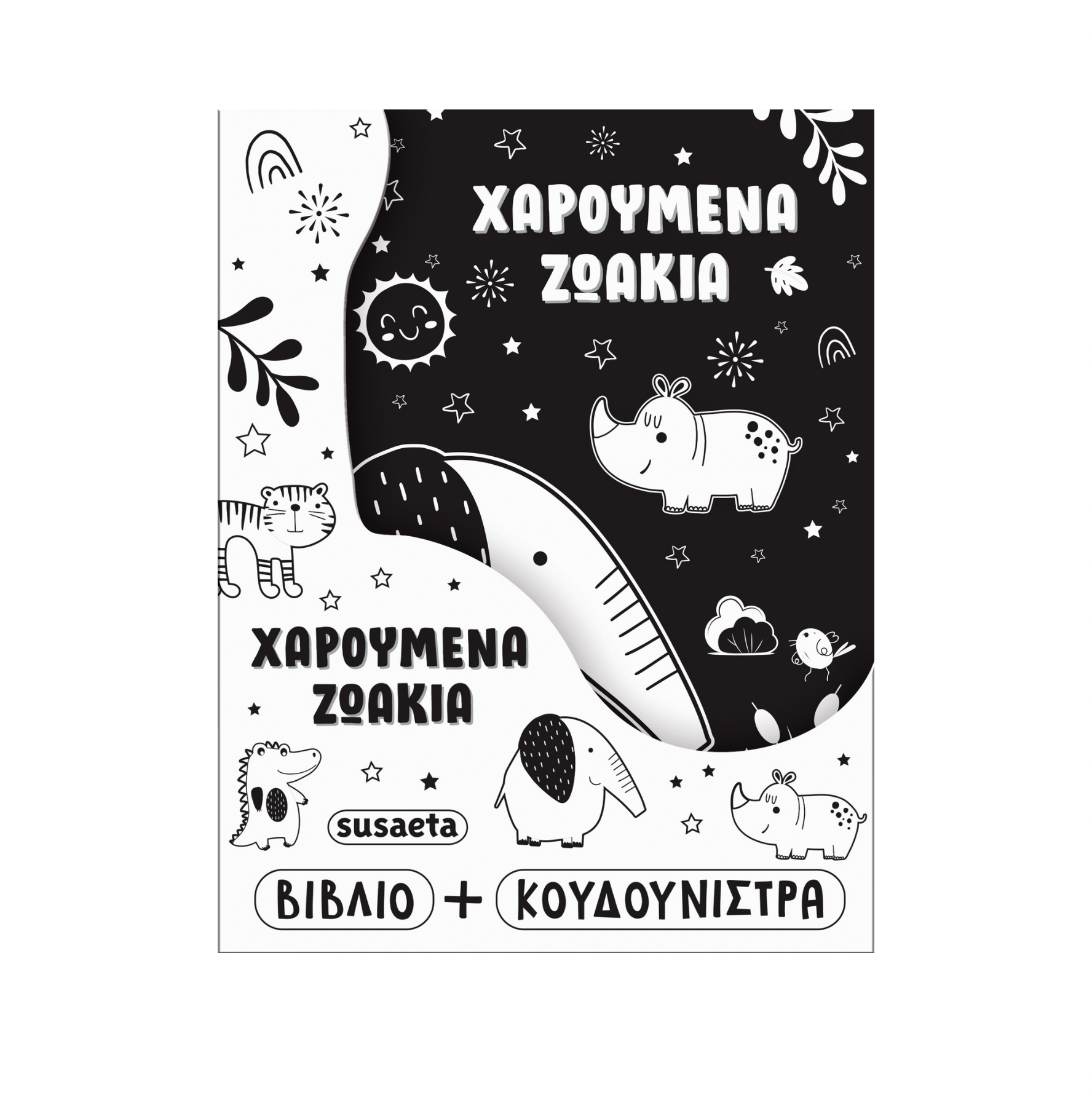 Ένα υφασμάτινο βιβλίο με χαριτωμένα ζωάκια σε ασπρόμαυρα σχέδια, που διεγείρουν την όραση των βρεφών και τα βοηθούν στη συγκέντρωση. Επιπλέον, η κουδουνίστρα-ελέφαντας θα τους κρατήσει όμορφη συντροφιά όλες τις ώρες της ημέρας!