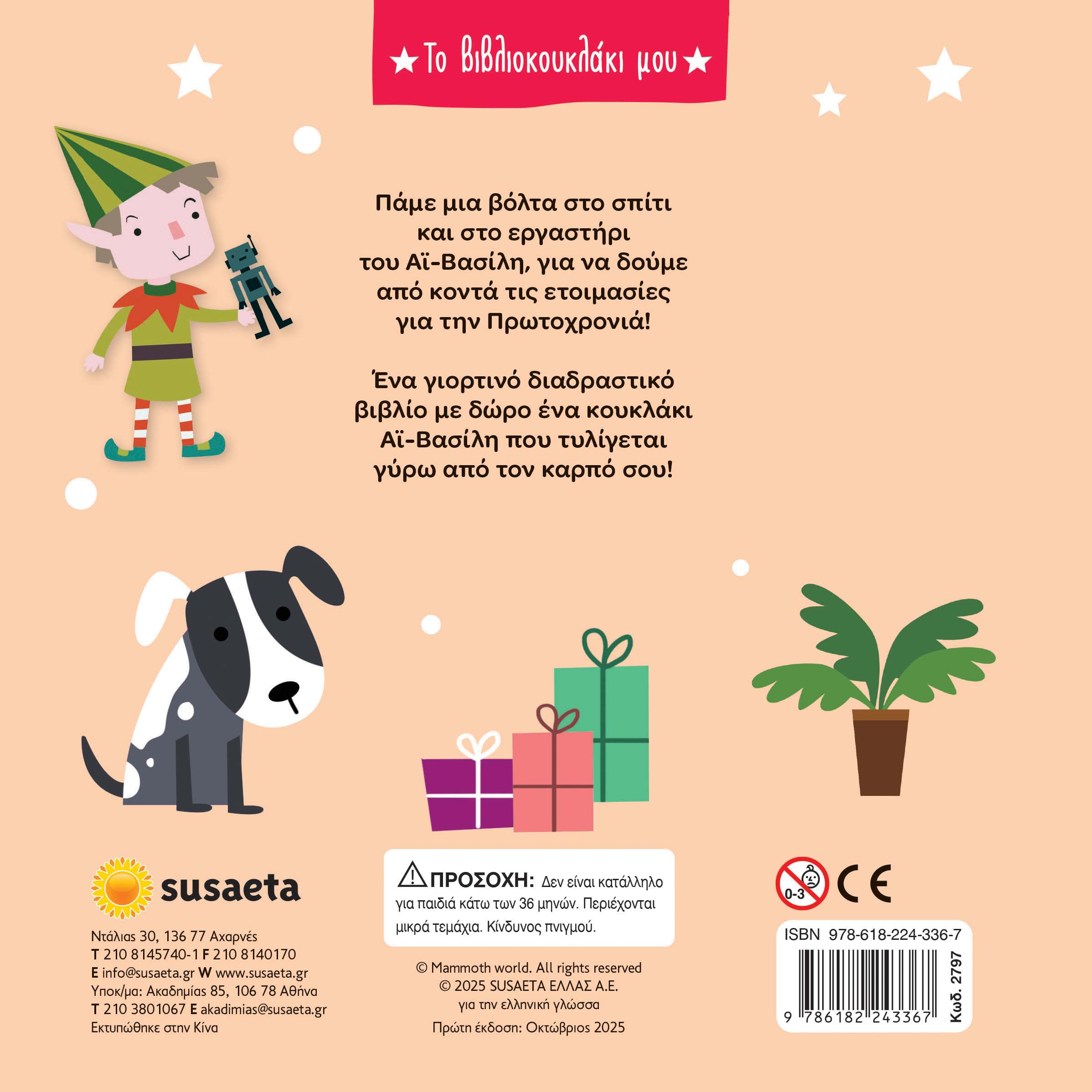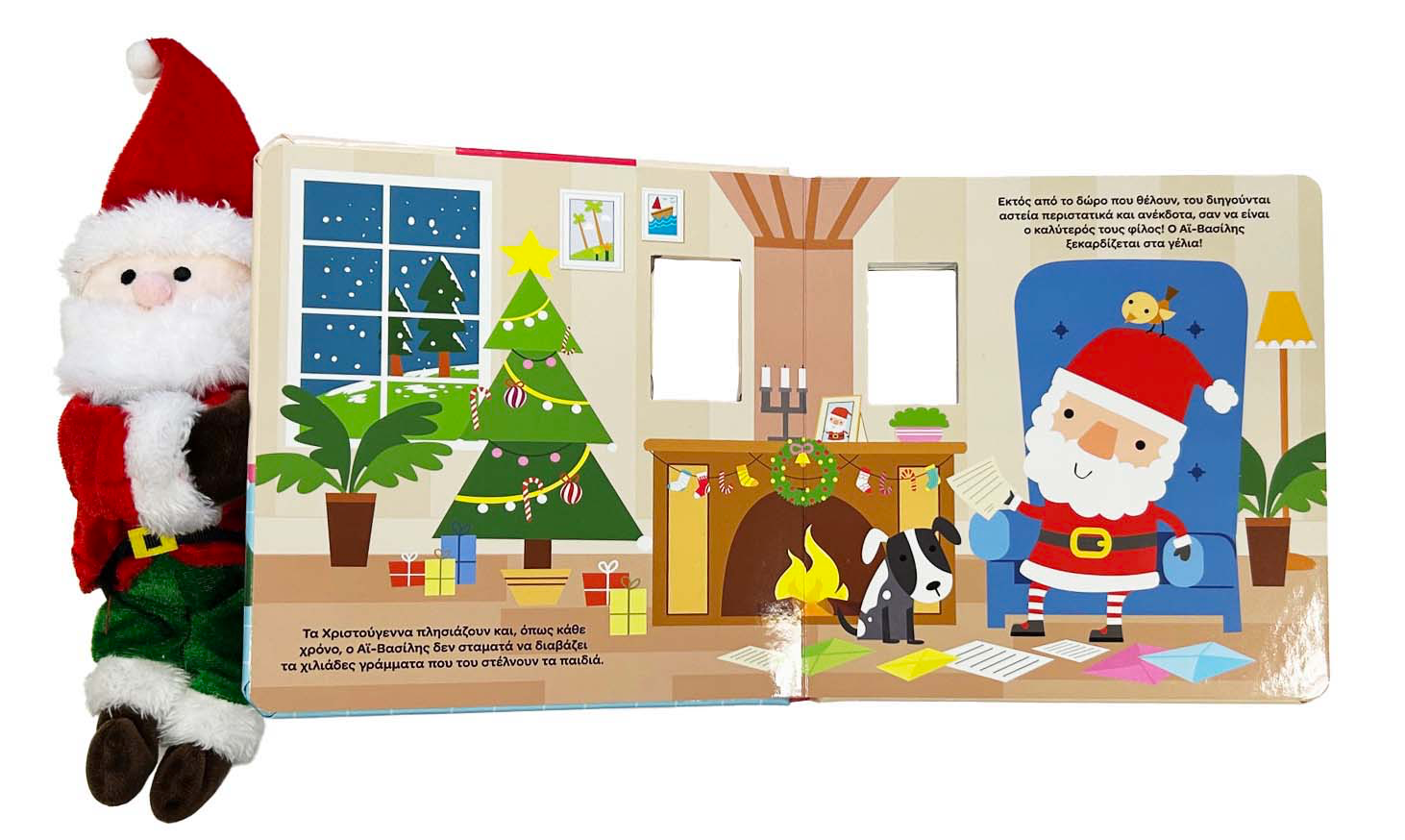 Στην αφήγηση, το παιδί θα κάνει μια «βόλτα» στο σπίτι και το εργαστήρι του Αϊ-Βασίλη, θα δει τα ξωτικά, τα έλκηθρα, τα στολισμένα δώρα και τις ετοιμασίες για Πρωτοχρονιά! Το βιβλίο συνοδεύεται από ένα κουκλάκι που τυλίγεται γύρω από τον καρπό!