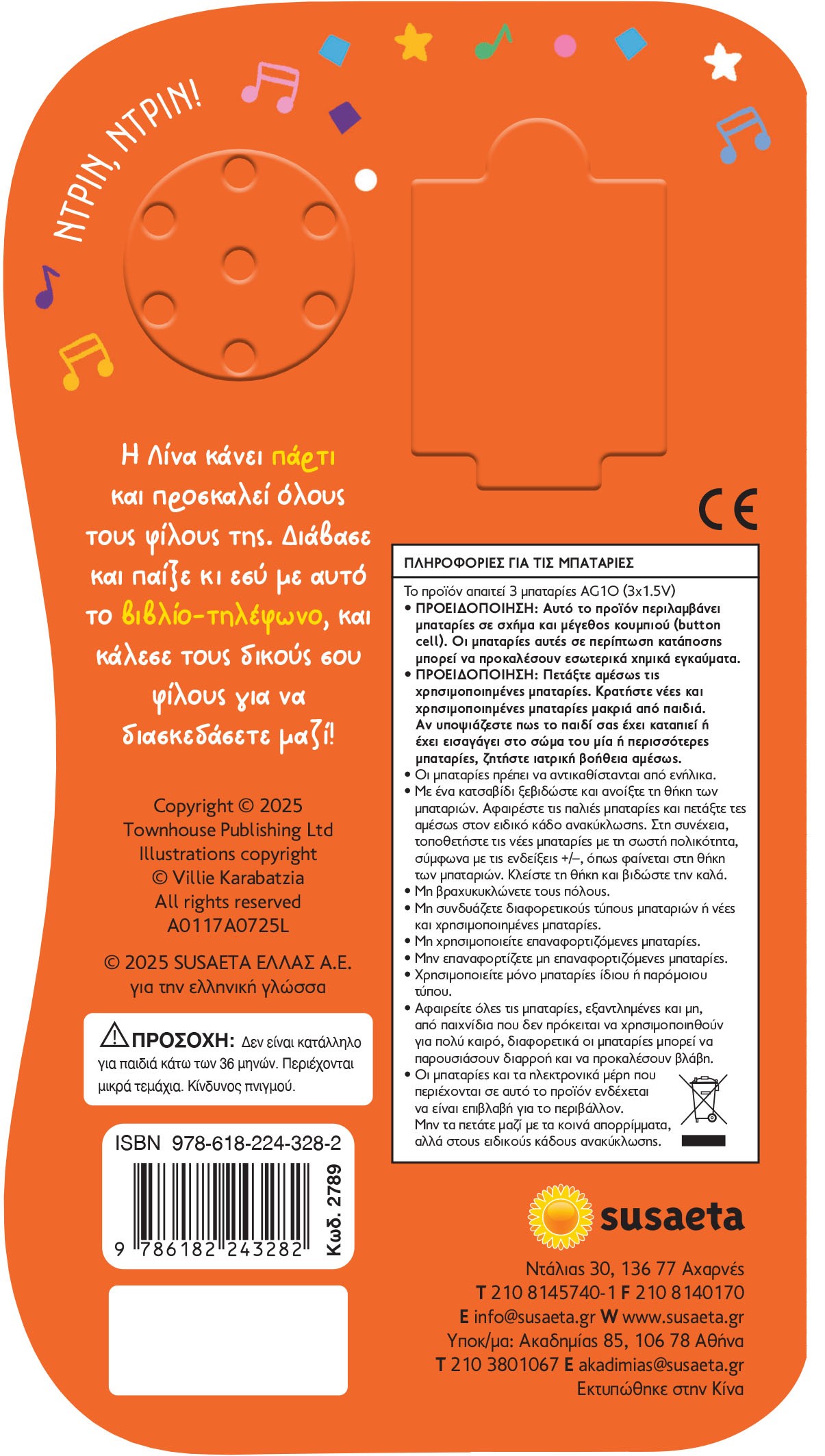 Στο ήχο-βιβλίο «Ντριν! Ντριν! Το πρώτο μου βιβλίο-τηλέφωνο» από τις Εκδόσεις Susaeta, η Λίνα κάνει πάρτι και προσκαλεί όλους τους φίλους της! Διάβασε και παίξε κι εσύ με αυτό το βιβλίο-τηλέφωνο, και κάλεσε τους δικούς σου φίλους για να διασκεδάσετε μαζί!